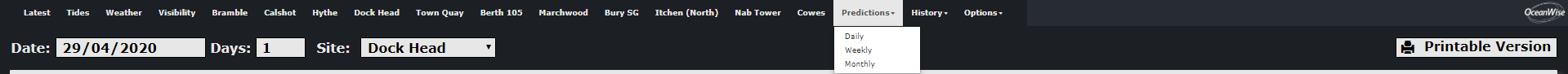 The Monthly option provides a different view of the predictions. Times of HW and LW for each day of the month are provided, along with a predicted tidal height value for each of the tidal states.